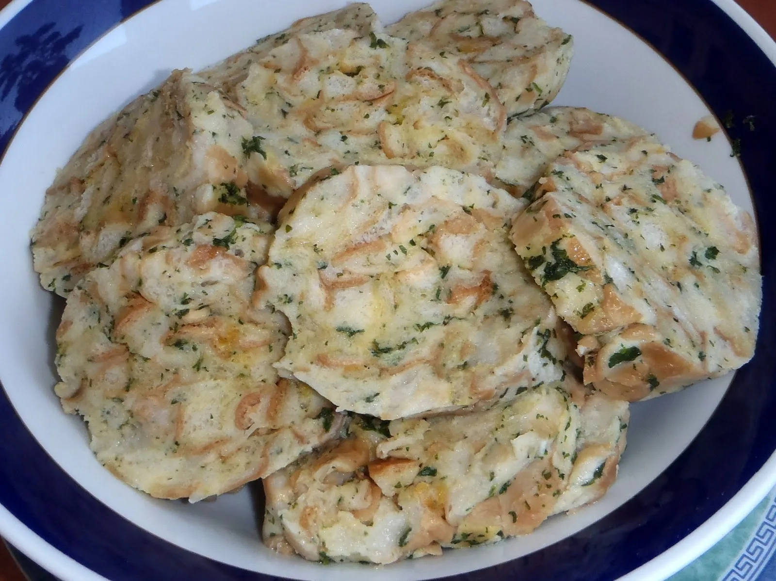 - Vzniklou směs klademe na potravinovou fólii, zavineme, zamotáme a vytvarujeme do podlouhlého knedlíku (směs vystačí na 4 knedlíky)